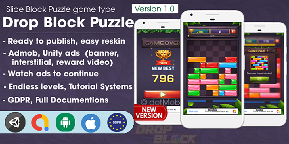 Drop Block Puzzle is trending game puzzle game on Google Play and App Store .This game helps you reduce time to build a similar game easy. You do not need to know any programming language to configure and use it. It is very easy to fill it with your own tasks, make UI changes,change your Admod, Unity, IronSource ID start to gain experience in promoting your game and earning money. We will support you until you feel the most satisfaction for this asset.